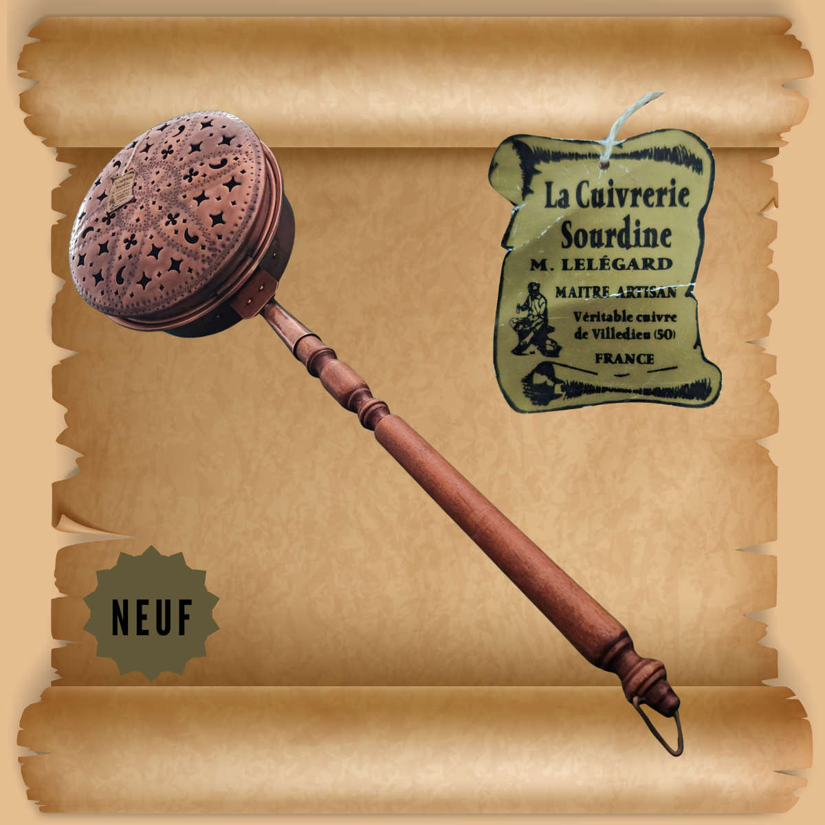 Bassinoire ou chauffe-lit en cuivre verni fabriqué à La Cuivrerie Sourdine M. Lelégard (France), c’est un ustensile ménager ancien utilisé pour réchauffer les draps et la literie grâce aux braises chaudes placées à l’intérieur, longueur de 32″ (81,25cm). Article neuf