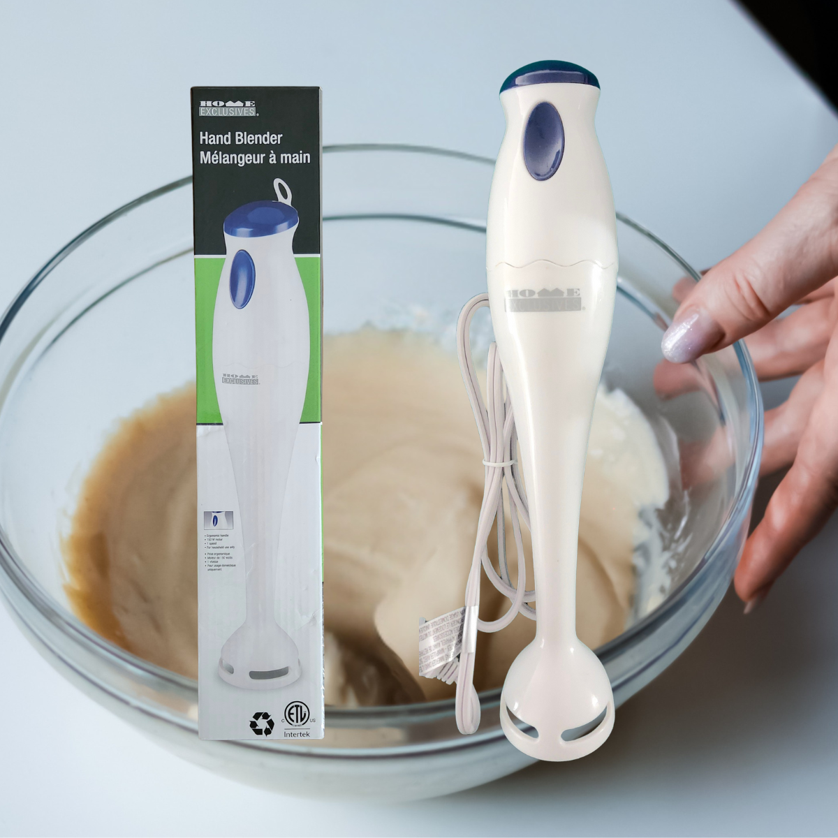 Mélangeur à main Home Exclusives, prise ergonomique, moteur 150 watts, 1 vitesse, couleur blanc et bleu – Article neuf