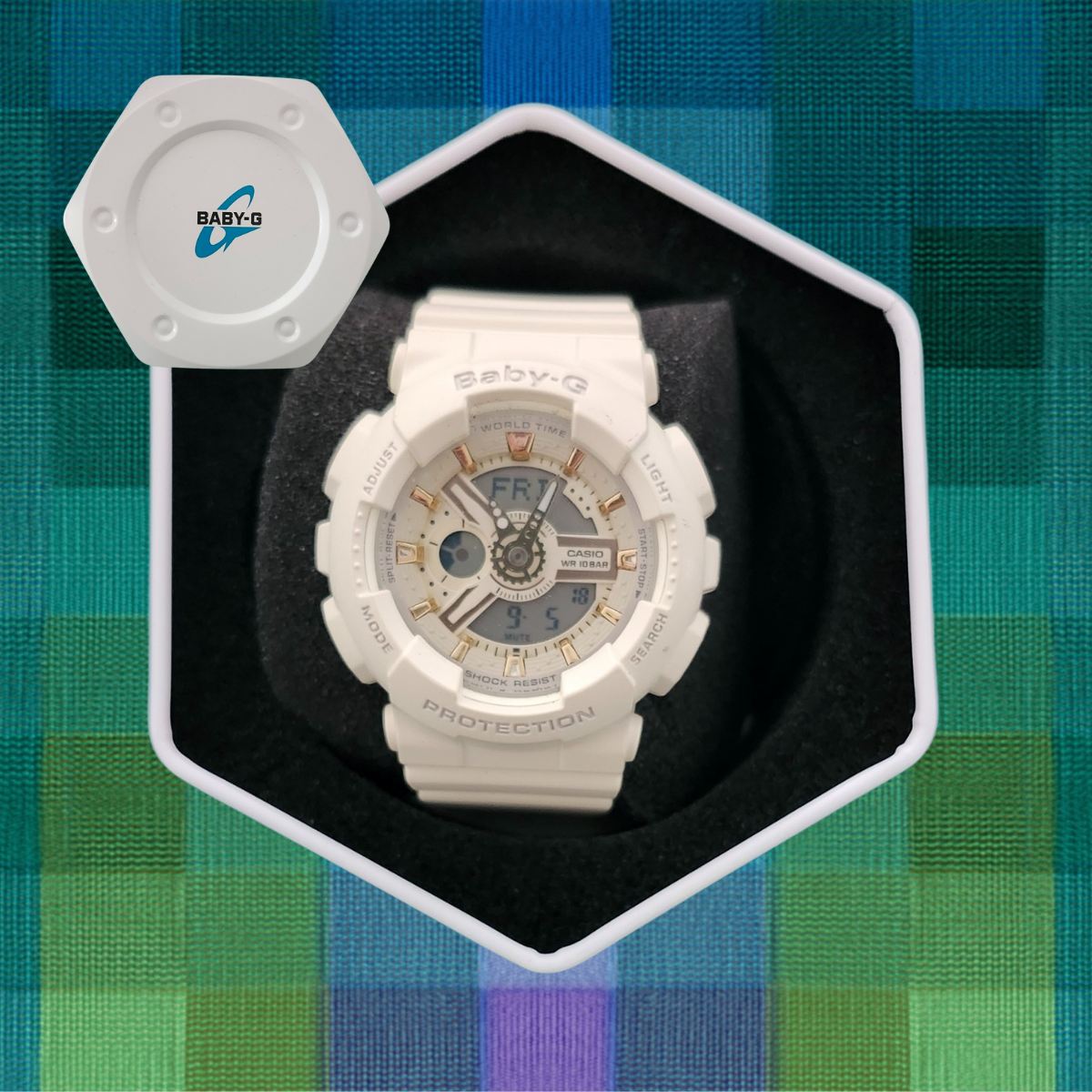 Montre Casio Baby-G modèle 5338 avec lumière LED, chronomètre, minuterie, alarme, couleur blanc cassé, excellent état.
